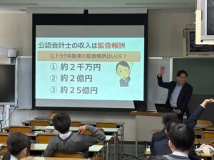 また、公認会計士と決算書の関わり、公認会計士の仕事内容や魅力、公認会計士試験制度、公認会計士になるための大学選択等についてもお話ししました。